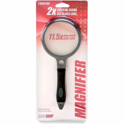The SG-10 SureGrip from Carson Optical is a 2x power Handheld Magnifier with an ergonomically designed soft-grip handle for the ultimate in comfort. Its crystal-clear all glass lens gives you a sharp distortion-free view, and a 10x high-power spot lens allows you to see even the finest details with ease. This Magnifier is a great low vision aid and assists in reading small print. The SureGrip Magnifier comes with a soft-padded zipper pouch to protect both lenses.