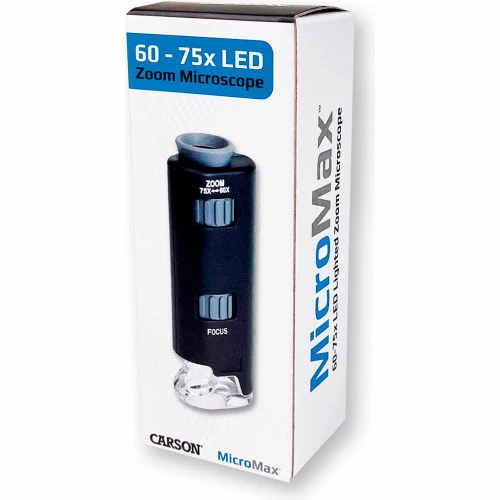 The MM-200 MicroMax LED™ from Carson Optical is a powerful 60-100x power Magnification Pocket Microscope with an extremely lightweight and portable design. This Pocket Microscope features a built-in LED light that provides a bright, clear image and a rubberized eyepiece for comfortable viewing. The MicroMax LED™ fits easily in your Pocket so you can bring it with you anywhere.