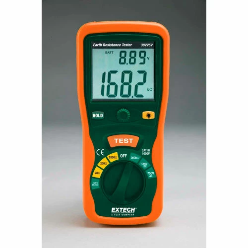 Earth ground resistance tester measures in 3 ranges from 20 to 2000 ohms. Additional measurements include: AC/DC voltage, resistance and continuity.