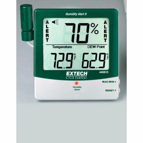 Ideal for monitoring environmental conditions (temperature, humidity and dew point) in laboratories, storage areas, manufacturing assembly areas and other controlled environments, the humidity alert meter features a user settable alarm and will warn you, both audibly and visually, when adverse conditions occur. High humidity can create a breeding ground for mold and low humidity can create static electricity. The 445815 also displays the dew point reading which is a calculation of temperature and humidity and used to determine when condensation will occur. The humidity alert meter features a remote probe that can either clip onto the meter or extend on an 18 In. cable, where the user can take measurements behind walls, in ducts, or other areas that are difficult to access. It also features a large digit LCD screen, which allows for the simultaneous display of humidity, temperature and dew point.