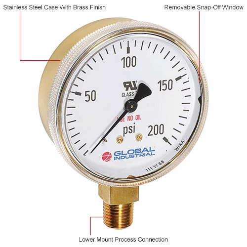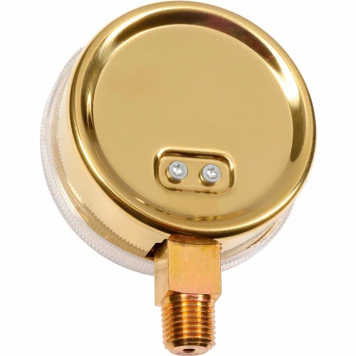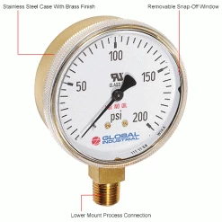 Global Industrial 2-1/2" Compressed Gas Gauge, 200 PSI, 1/4" NPT LM, Polished Brass