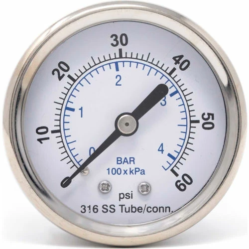 PIC Gauges 2.5" All SS Pressure Gauge, 1/4" NPT,0/60 PSI, Dry Fillable, Ctr Back Mount, 302D-254D