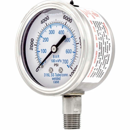 PIC Gauges 2.5" All Stainless Pressure Gauge, 1/4" NPT, 0/10,000 PSI, Glycerine Fill, LM, 301L-254U