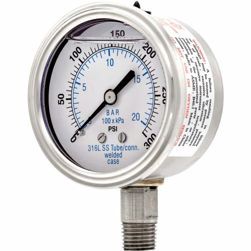 PIC Gauges 2.5" All Stainless Pressure Gauge, 1/4" NPT, 0/300 PSI, Glycerine Filled, LM, 301L-254H