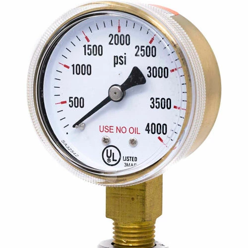 “Use No Oil” pressure gauge designed for use on compressed gas regulators and tanks. Highly polished Brass Copper alloy case, twist off lens, brass and copper alloy internals. 2″ Dial. 0/4,000 PSI. 1/4″ NPT. Dry Non-Fillable. Lower Mount.